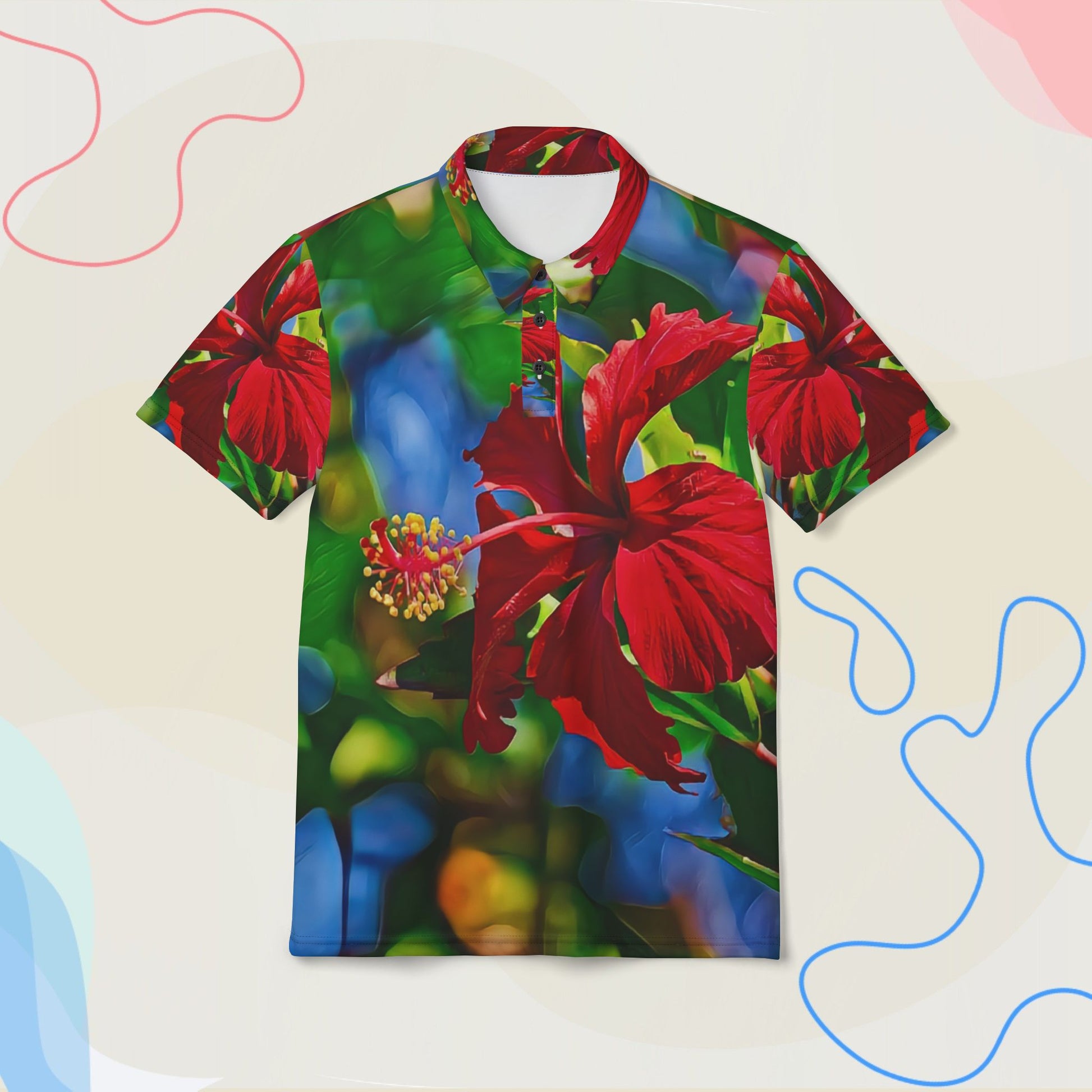 “Classic island bloom—this hibiscus polo radiates vibrant energy and timeless tropical charm.”