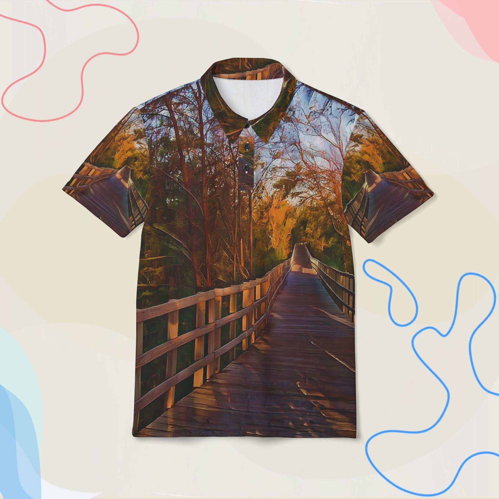 "Embrace the tranquil charm of the season. Immersive, all-over landscape of a sun-lit wooden path journeying through a vibrant forest canopy, perfectly captures the stillness of a woodland stroll, offering a sophisticated look for nature lovers."