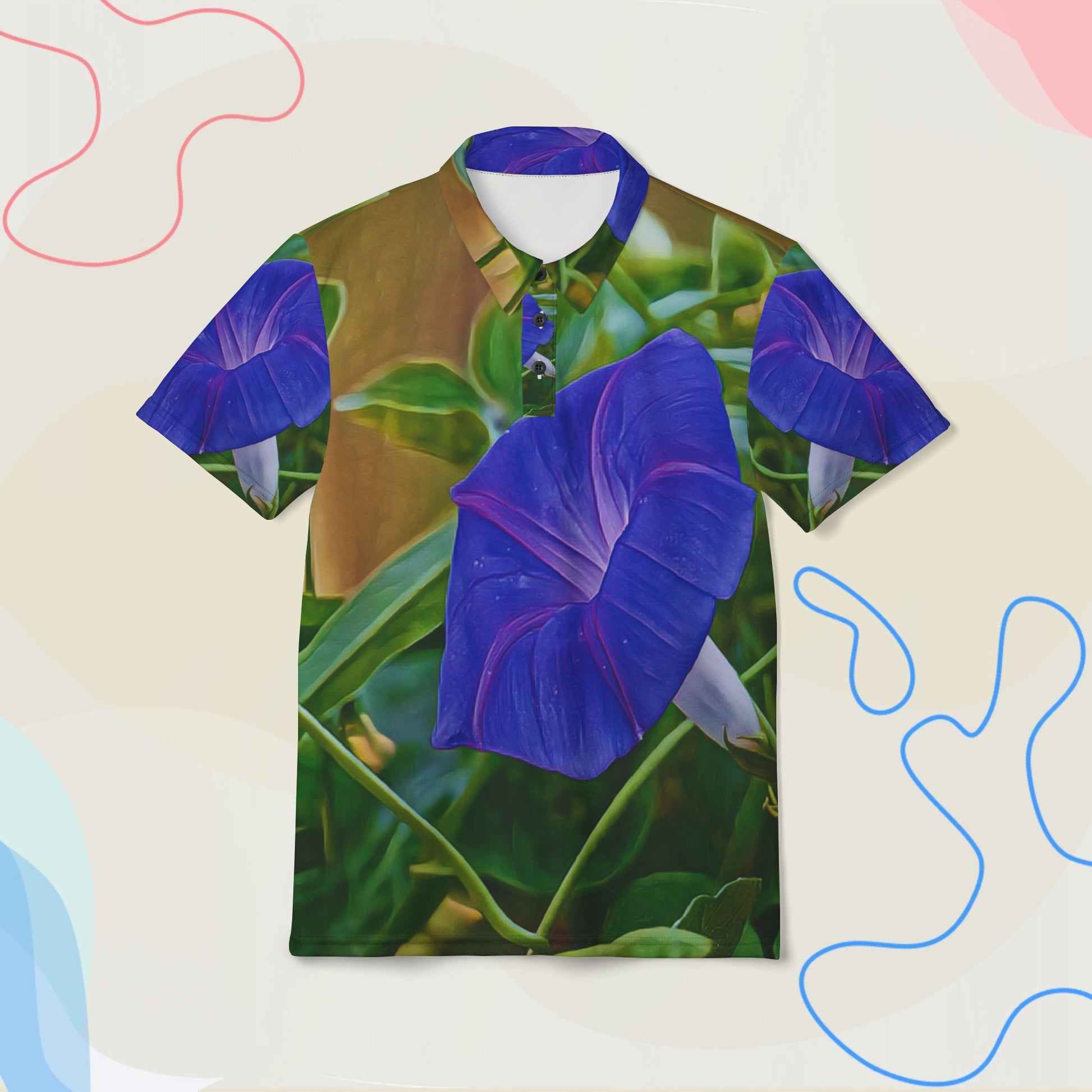 “Lush and luminous—this morning glory polo blooms with vivid purple petals and deep green elegance.”
