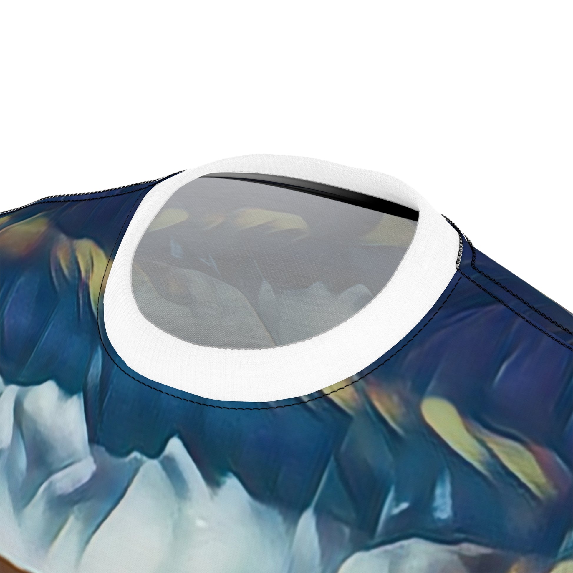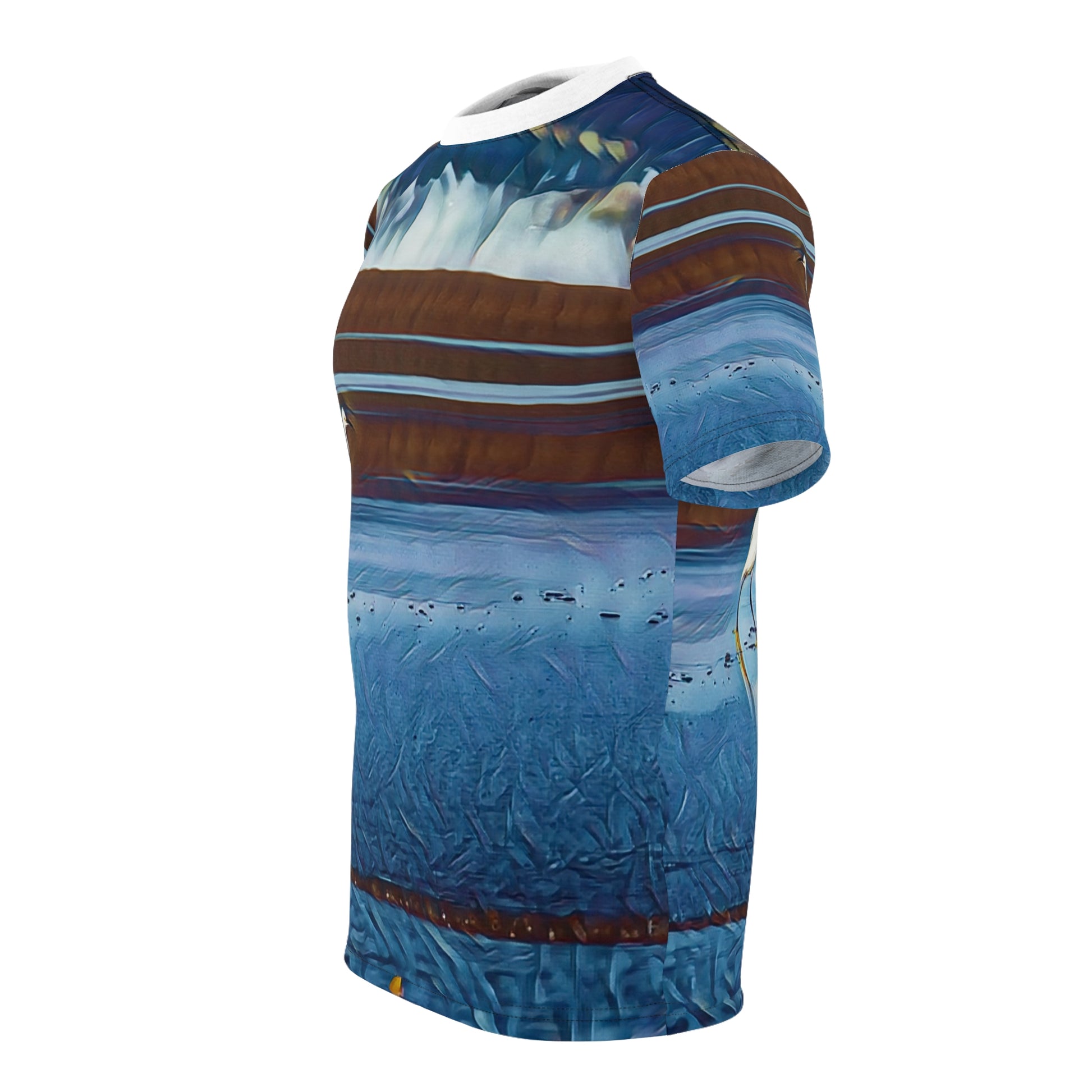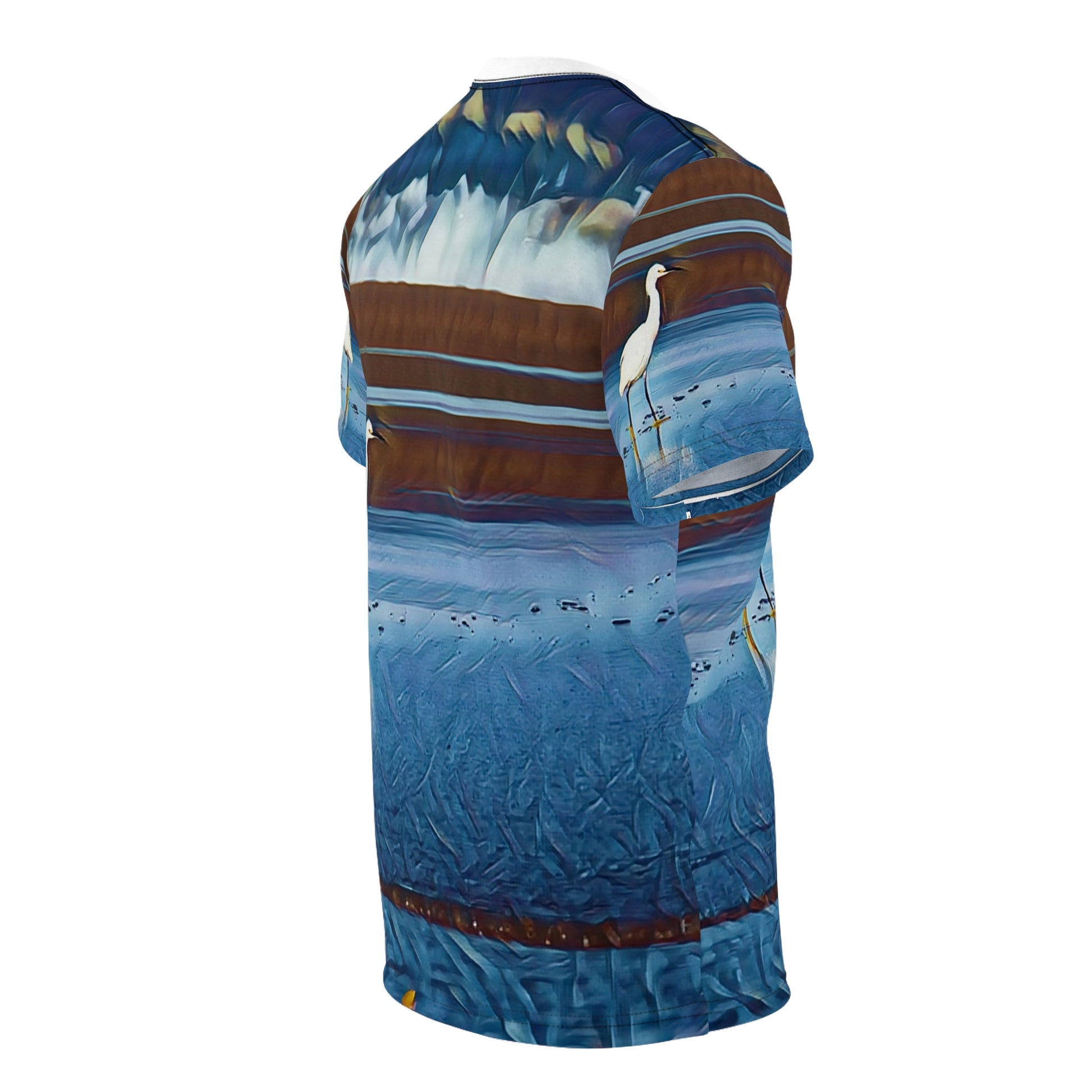 Shop the Embrace the beauty of nature with our Coastal Hunter Heron Unisex All Over Print Tee. Featuring a striking white heron set against an artistic, abstract coastal horizon, this shirt is a true piece of wearable art.