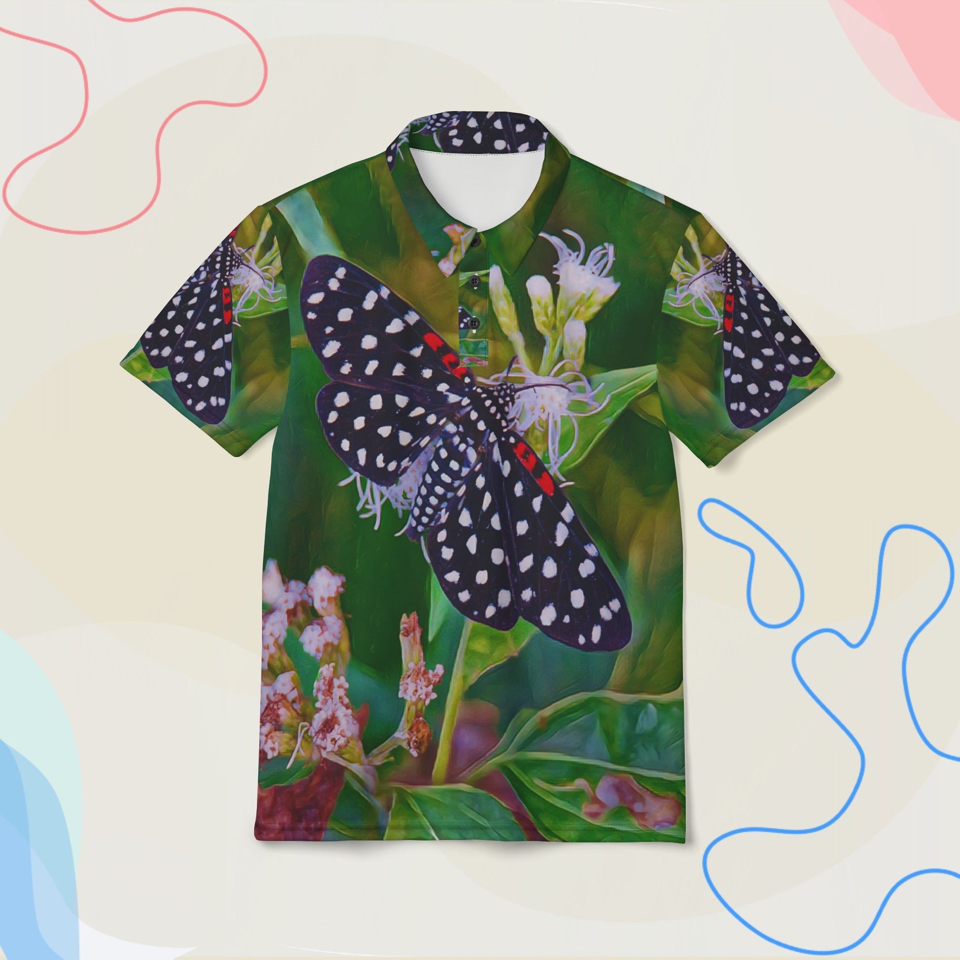 “Elegant and earthy—this butterfly polo showcases a striking black-winged beauty amid soft florals and lush greenery.”
