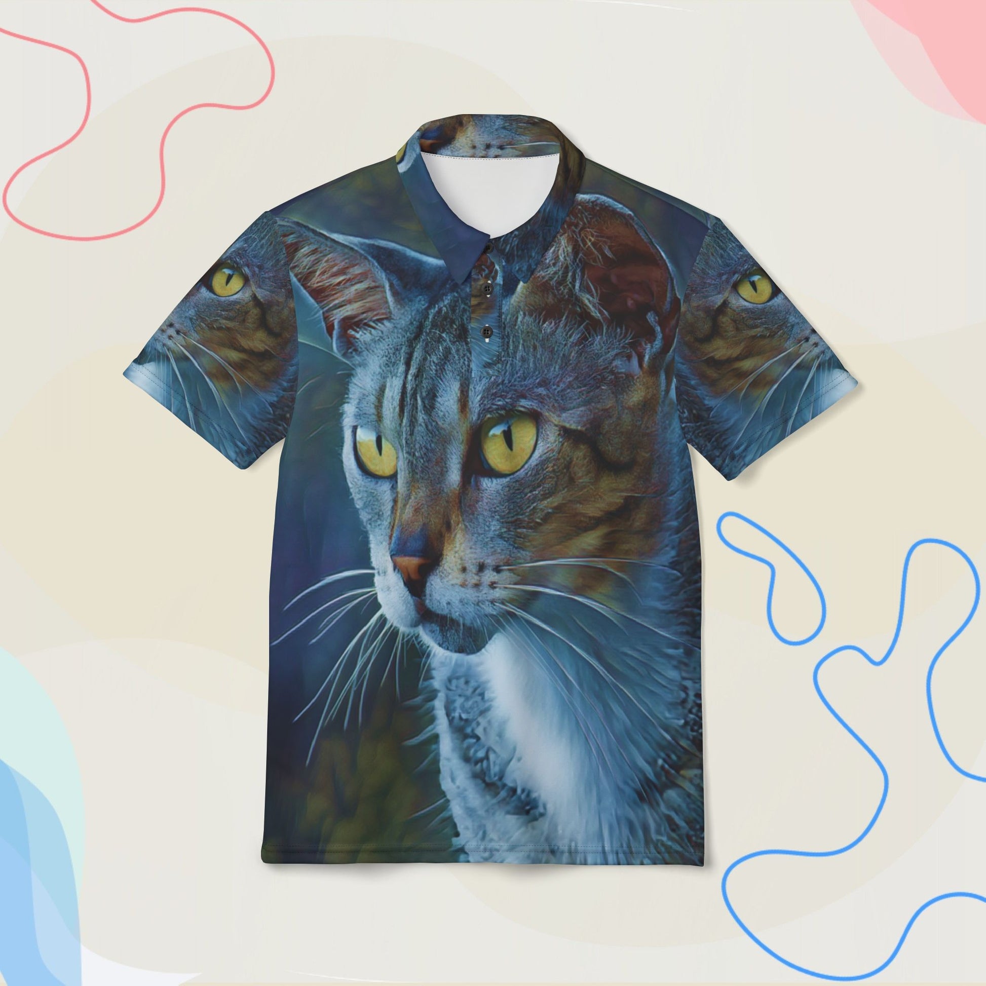 “Striking yellow eyes and bold feline energy—this cat-print polo is pure attitude in motion.”