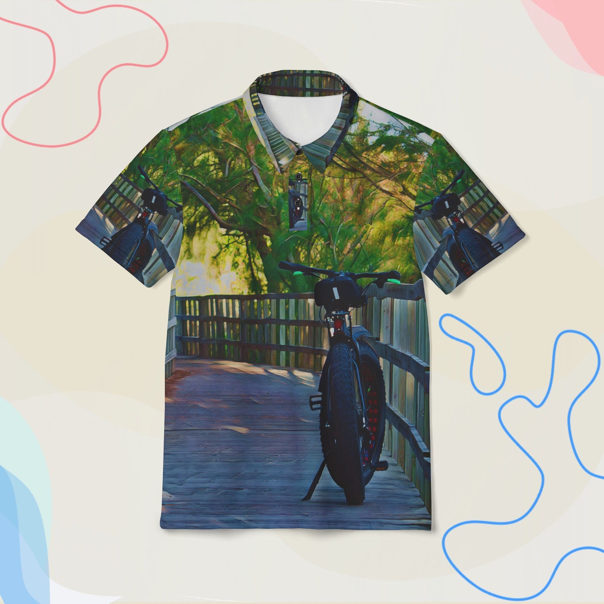 “Peaceful and scenic—this fat bike polo captures a sunlit forest path with lush greenery and tranquil charm.”