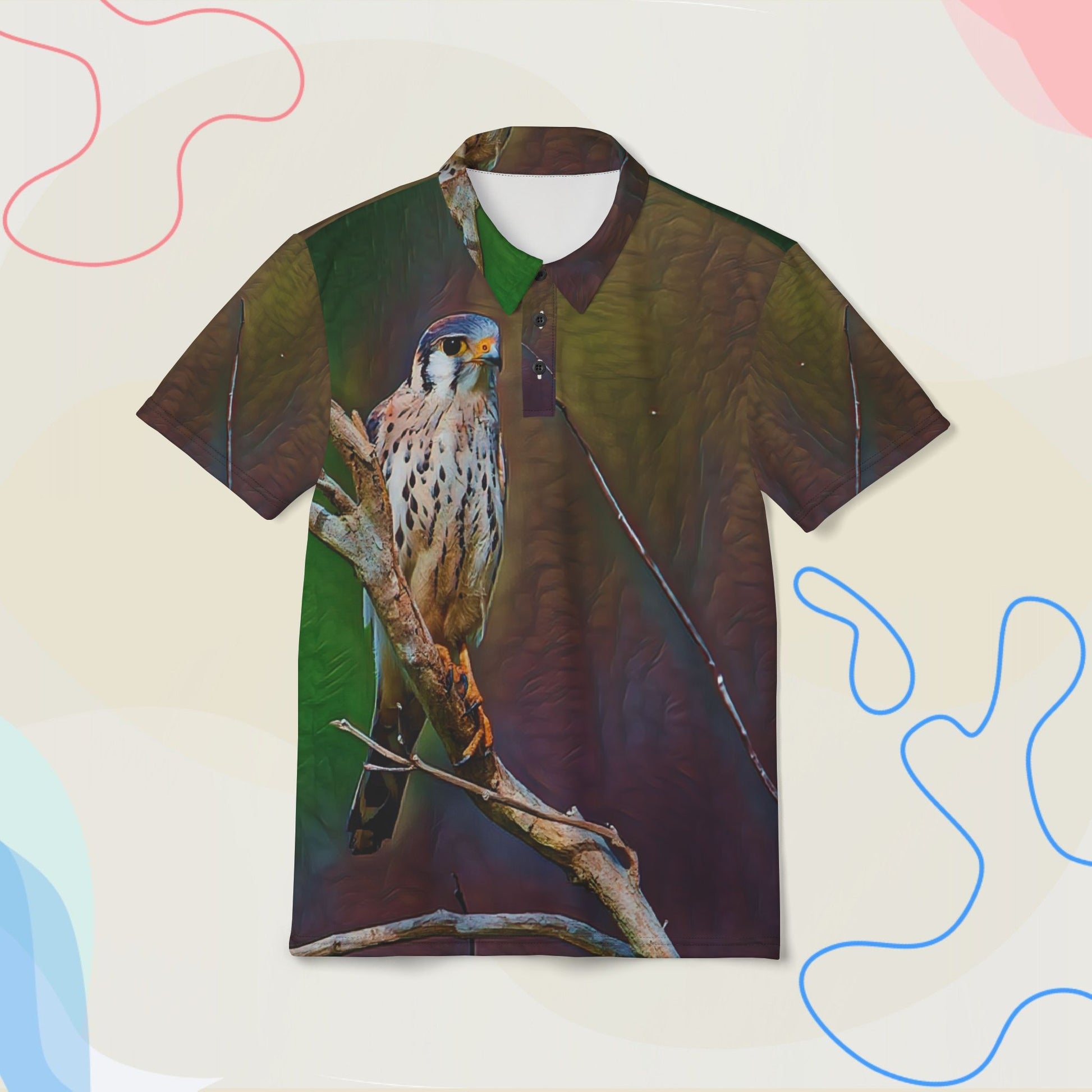 "Graceful and wild—this American Kestrel polo captures nature’s elegance with vivid detail and earthy tones."