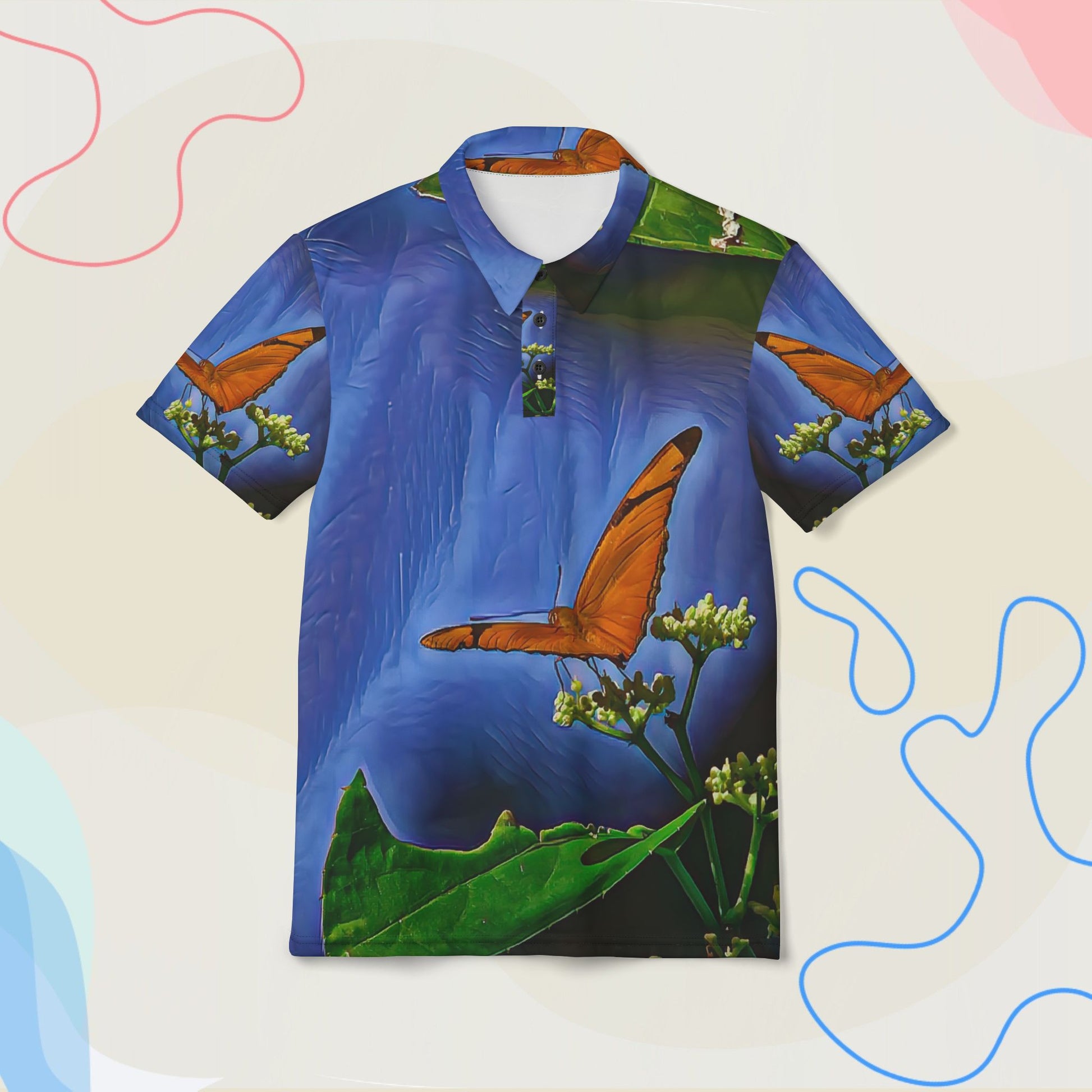 “Bright and graceful—this butterfly polo soars with orange wings among white blooms and leafy greens on sky blue.”