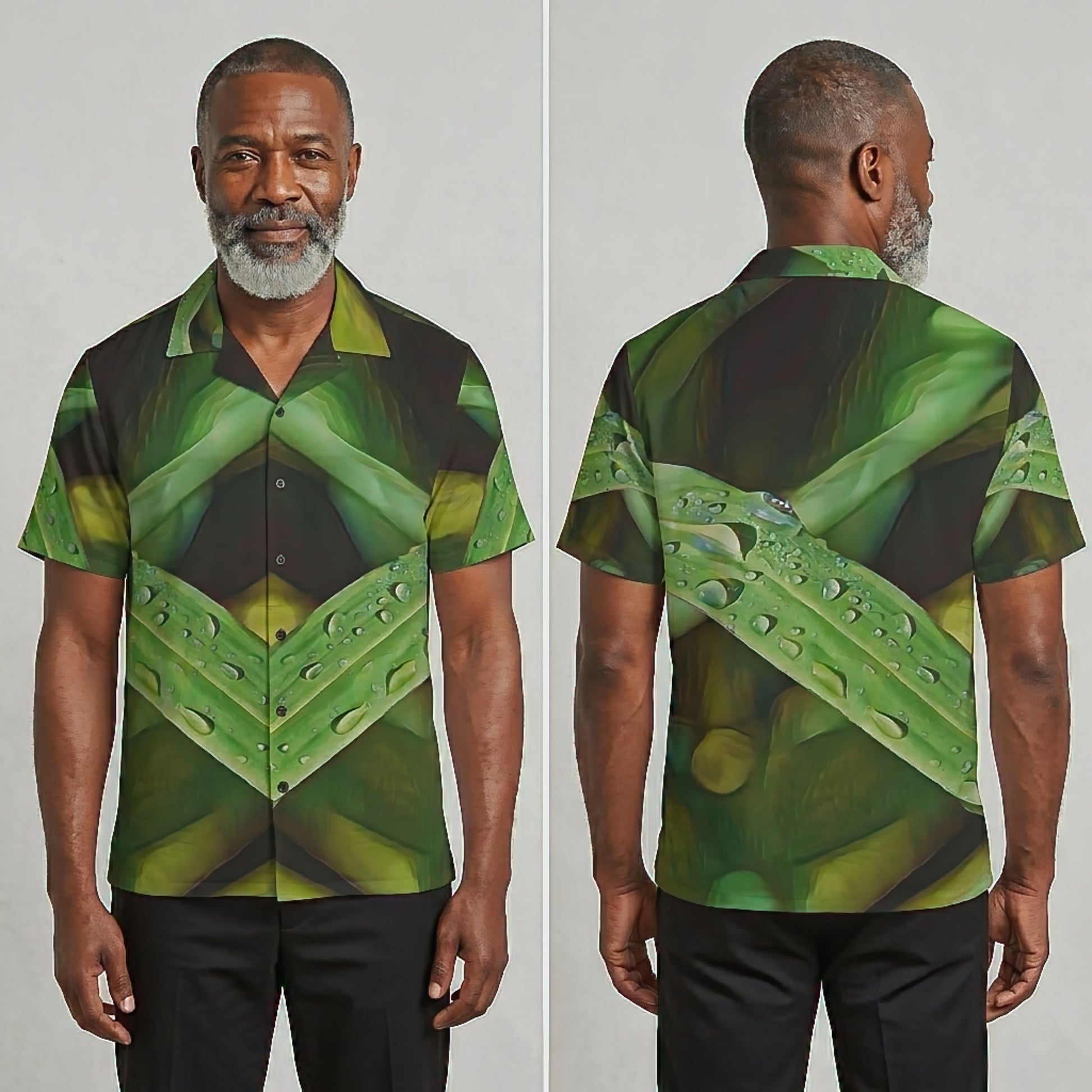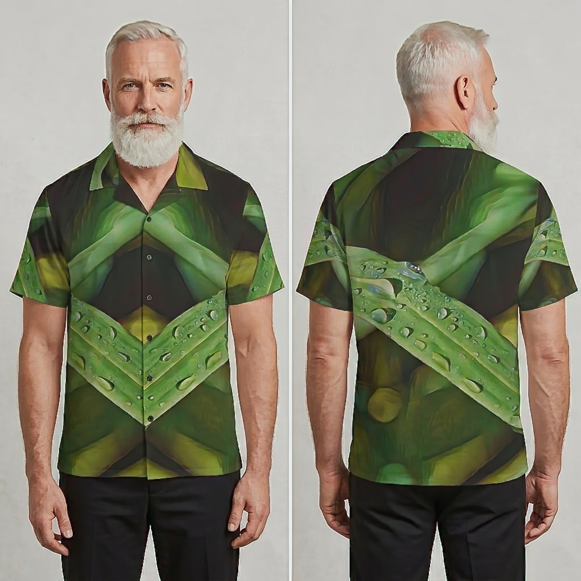 Refresh your style with our Morning Dew Rainforest Canopy Hawaiian Shirt. Featuring a crisp, all-over print of dew-covered leaves in a symmetrical design, this lightweight shirt brings tropical energy and modern comfort to any occasion.