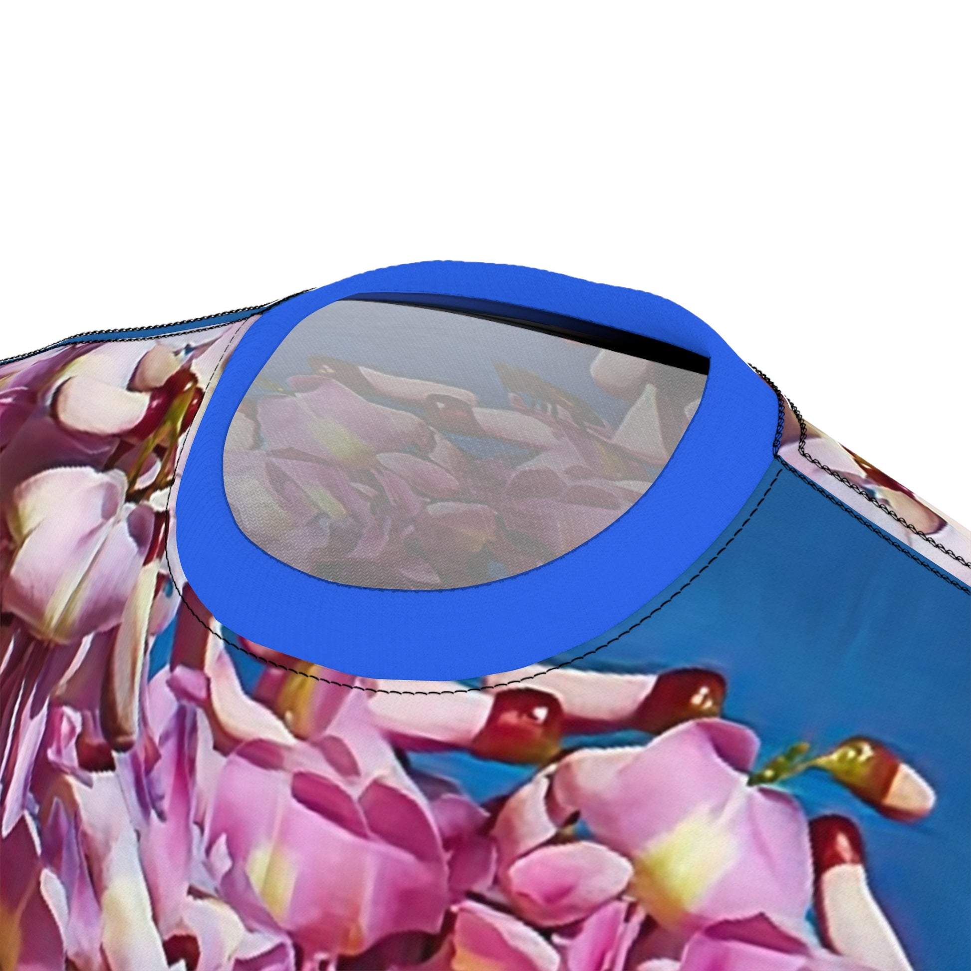 Shop the Morning Nectar Hummingbird Unisex All Over Print Tee. Featuring a vibrant hummingbird and pink floral design on premium, breathable fabric. Perfect for bird lovers.