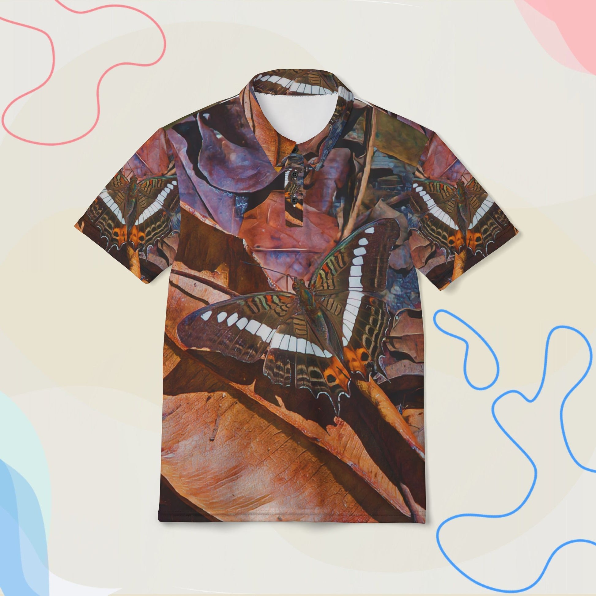“Earthy and intricate—this butterfly polo blends rich autumn tones with lifelike wings and textured foliage.”