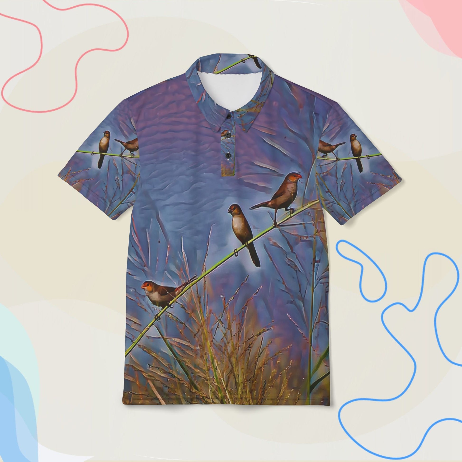"Twilight serenity—this polo features delicate songbirds perched in a dreamy blend of blue and violet hues."